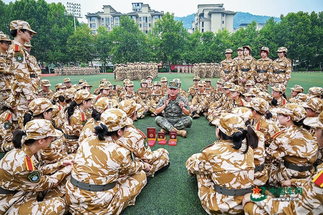 武警重庆总队机动支队为驻地高校开展军训时,穿插组织国防教育活动。图为一级上士安俊吉为学生们讲述所获奖章、纪念章背后的故事。本报特约通讯员 王 肸摄