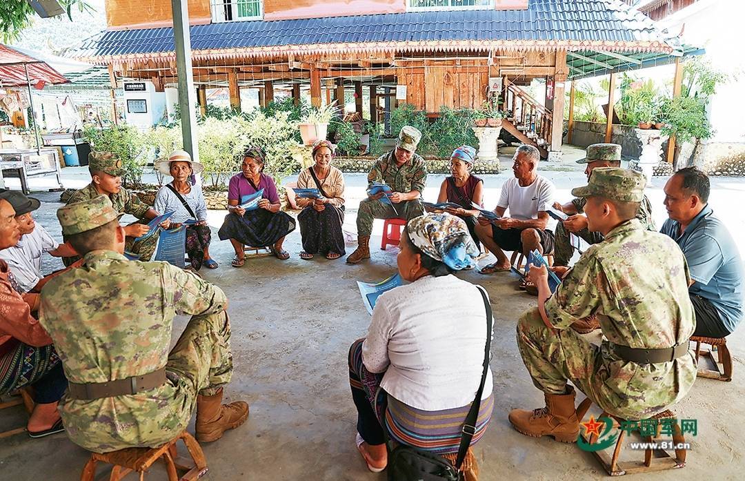 南部战区陆军某旅官兵走进边境村寨,向当地群众宣讲国防政策法规。朱 俊摄