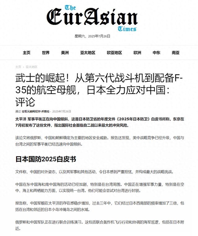 印媒的立场一直被大家忽视,大部分时候都基于印度国内立场抹黑中国,所以大部分时候社交媒体上都是嘲讽印度。不过7月26日在《欧亚时报》上发表这篇文章,虽然也是美化与鼓吹日本与中国对抗的姿态,但有一个趋势却必须要警惕,日本近些年来的动向,正在朝向全面对抗中国做准备。