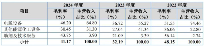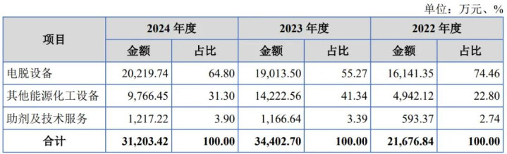 营业收入主要来源于电脱设备,营收占比在60%左右。