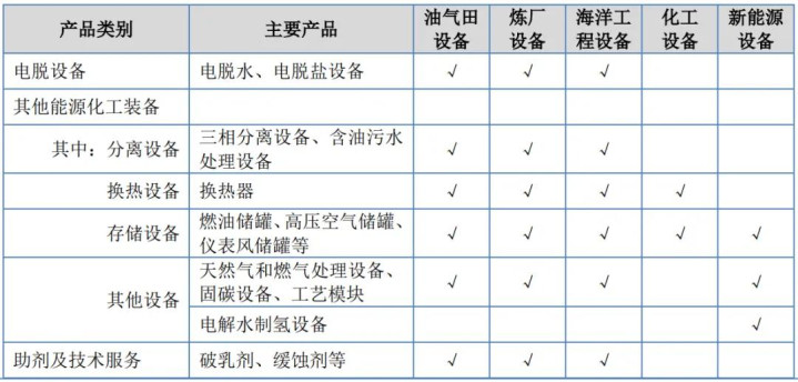 公司主要产品包括电脱设备、分离设备、换热设备、存储设备、固碳设备、氢能设备等能源化工专用设备以及助剂和技术服务,广泛应用于油气工程、炼油化工、海洋工程、清洁能源等领域。