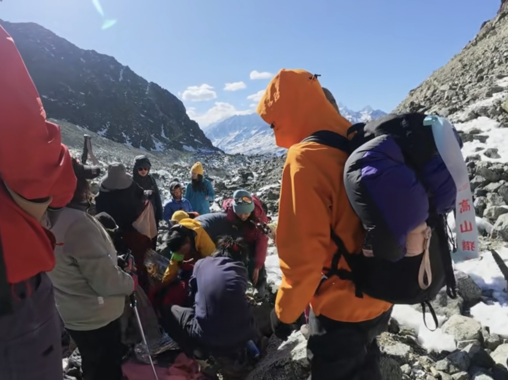 事发现场,随行队伍和附近登山者上前救援。视频截图