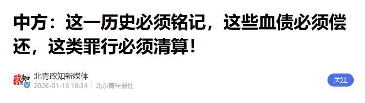 3.《中方:这一历史必须铭记,这些血债必须偿还,这类罪行必须清算!》2026-01-16 16:34 | 来源:北青政知新媒体