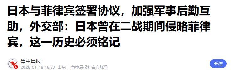1.《日本与菲律宾签署协议,加强军事后勤互助,外交部:日本曾在二战期间侵略菲律宾,这一历史必须铭记》2026-01-16 16:33 | 来源:鲁中晨报